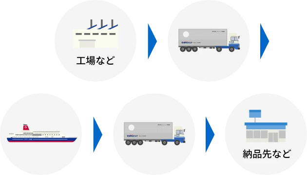 工場→転換地点(港)、転換地点(港)→納品先のみドライバーが運転を行い海上区間は無人航送とする事で移動距離を大幅に軽減します。